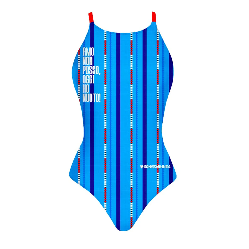 Costume intero da piscina, non sgambato, chiuso sui fianchi, realizzato in tessuto PBT, molto resistente al cloro, all’usura e alle sollecitazioni più estreme.