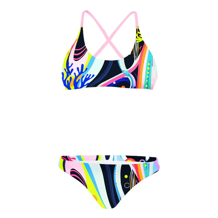 Costume due pezzi da piscina, vita bassa con laccio per poterlo regolare ed essere tranquilli anche per tuffi e virate.