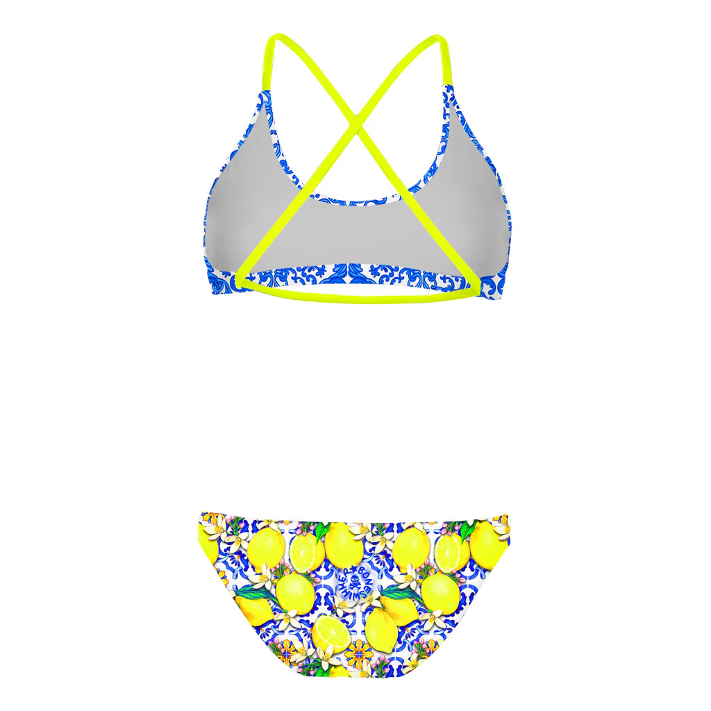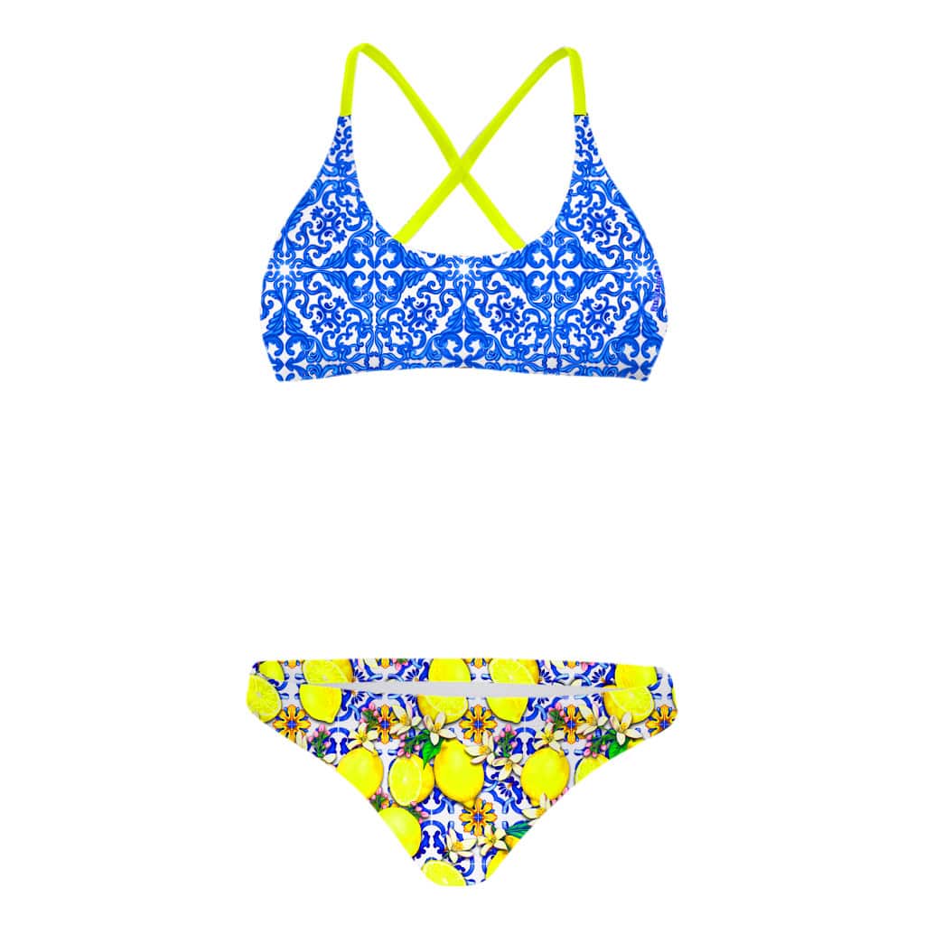 Costume due pezzi da piscina, vita bassa con laccio per poterlo regolare ed essere tranquilli anche per tuffi e virate.