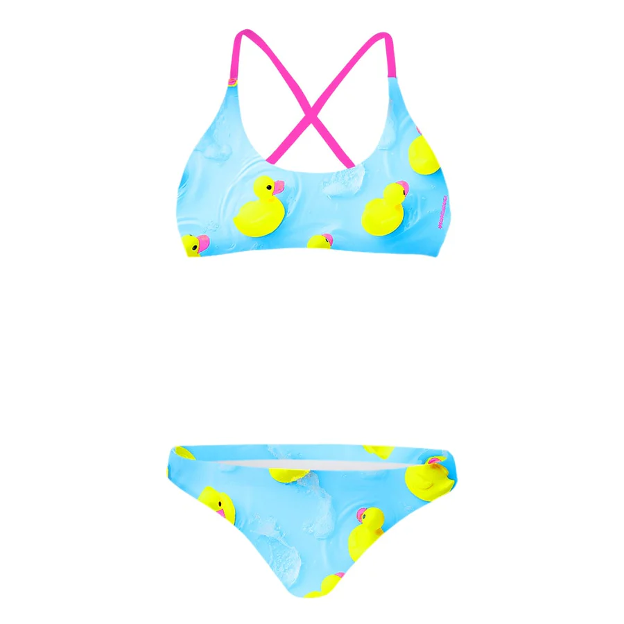 Costume due pezzi da piscina, vita bassa con laccio per poterlo regolare ed essere tranquilli anche per tuffi e virate.