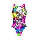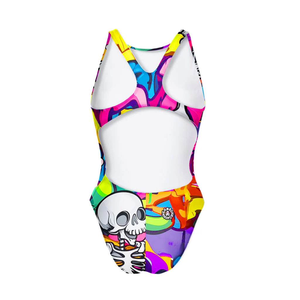 Costume intero sgambato con spalline larghe e aperto sui fianchi – 100%PL PBT resistente al cloro, all’usura e alle sollecitazioni più estreme.