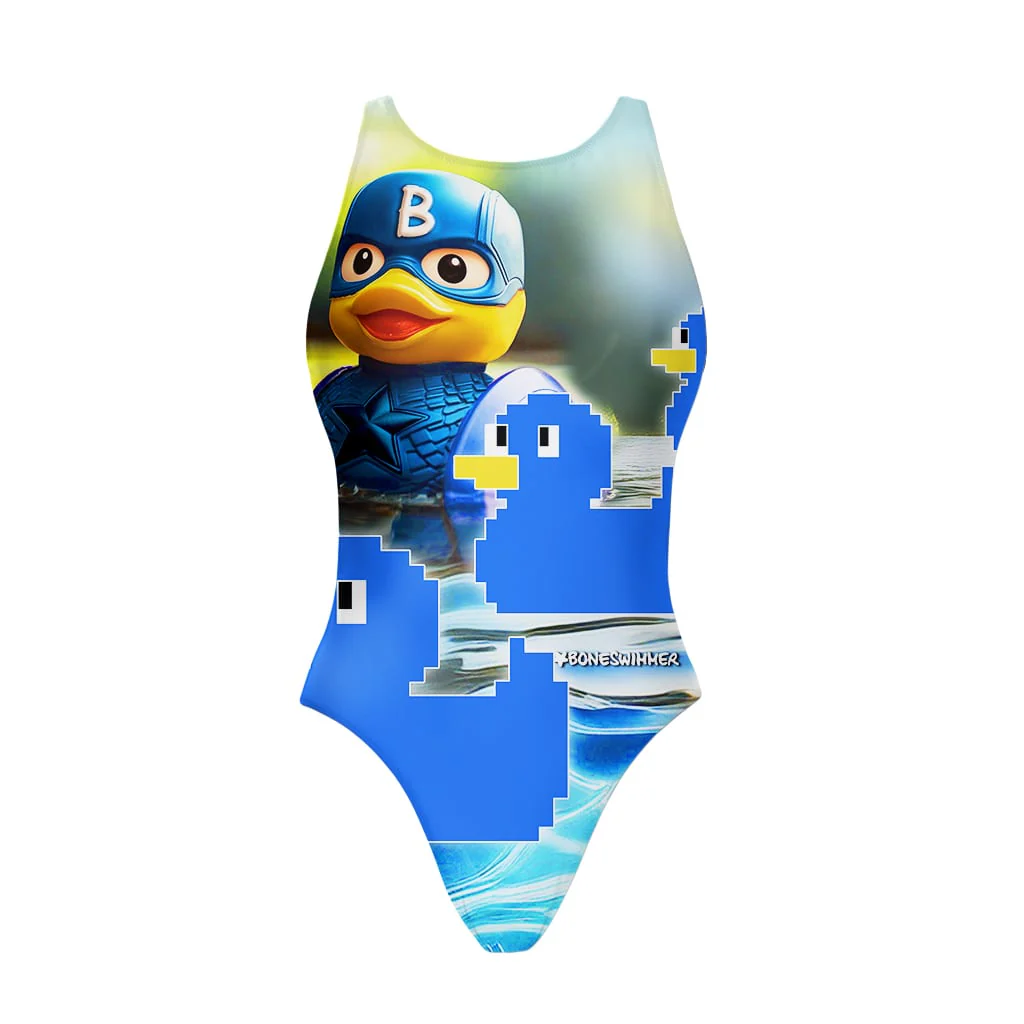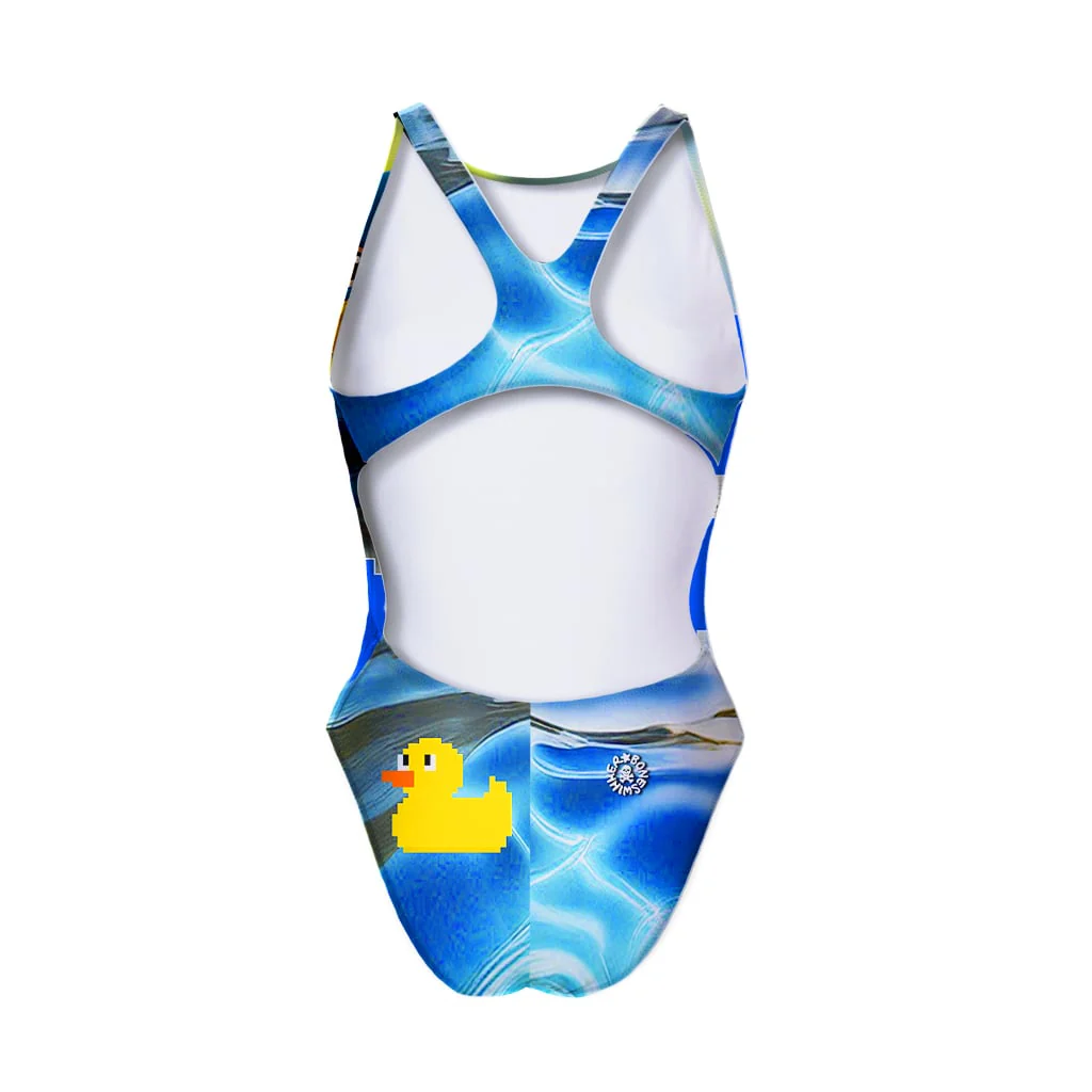 Costume intero sgambato con spalline larghe e aperto sui fianchi – 100%PL PBT resistente al cloro, all’usura e alle sollecitazioni più estreme.