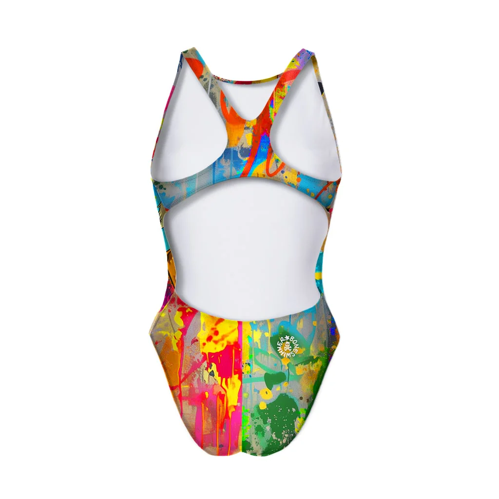 Costume intero sgambato con spalline larghe e aperto sui fianchi – 100%PL PBT resistente al cloro, all’usura e alle sollecitazioni più estreme.