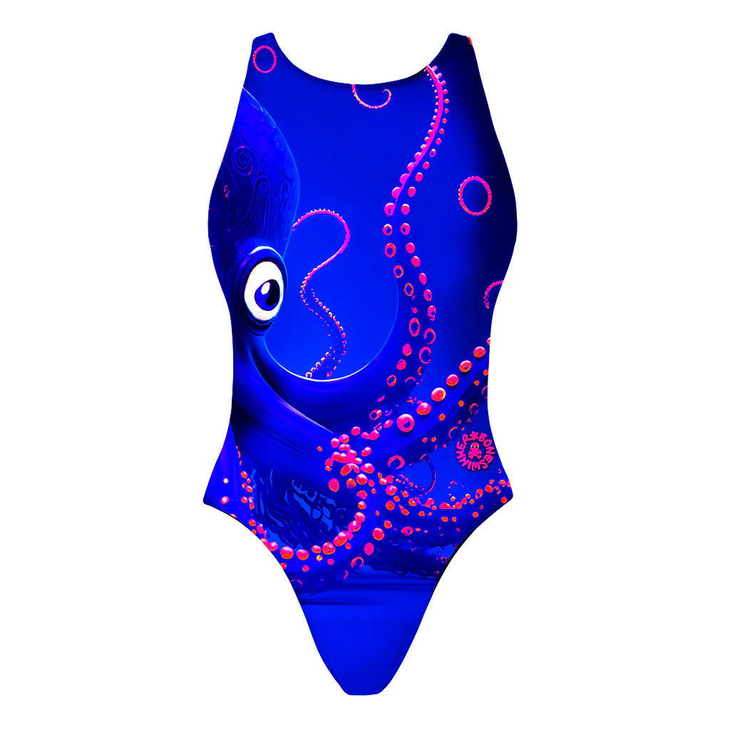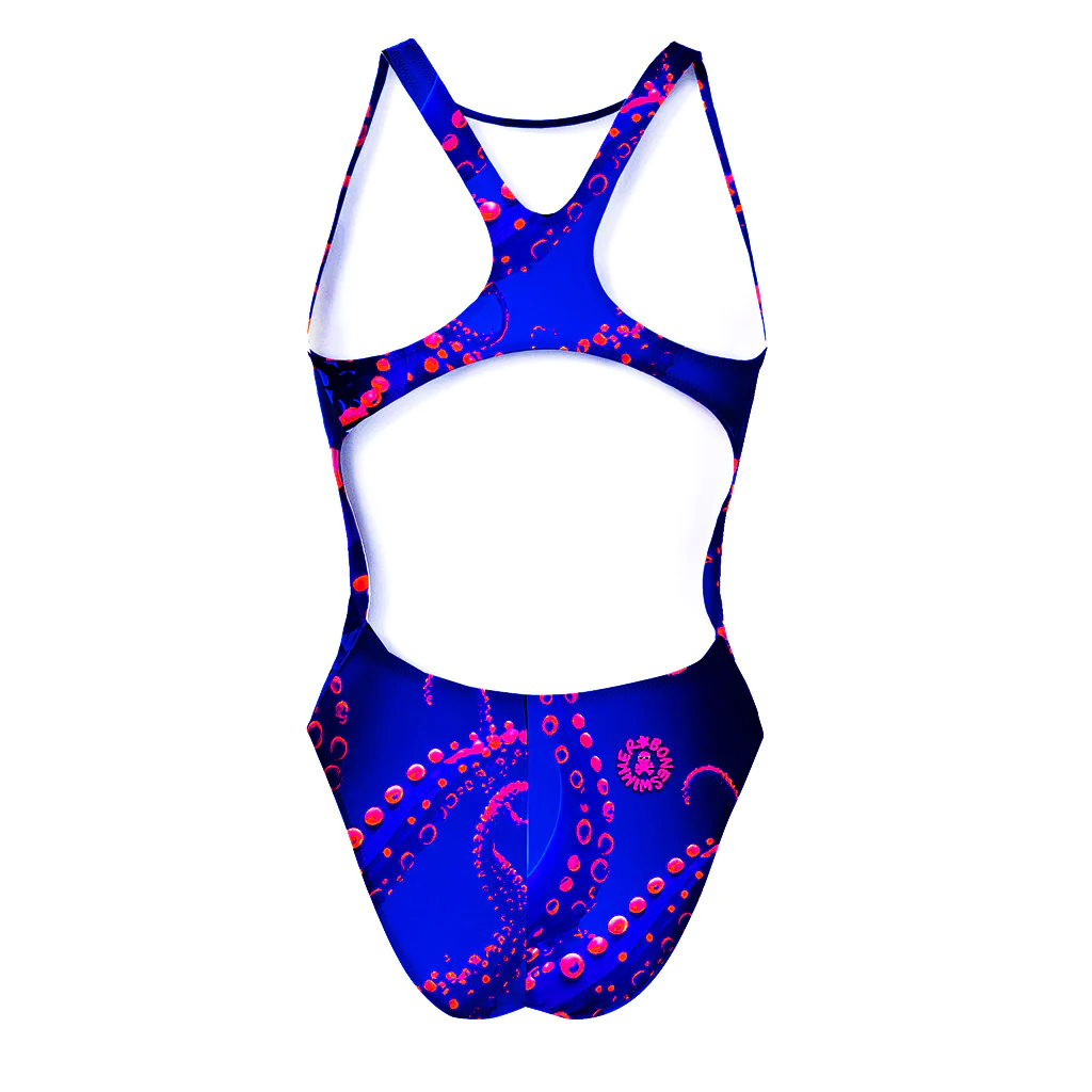 Costume intero sgambato con spalline larghe e aperto sui fianchi – 100%PL PBT resistente al cloro, all’usura e alle sollecitazioni più estreme.
