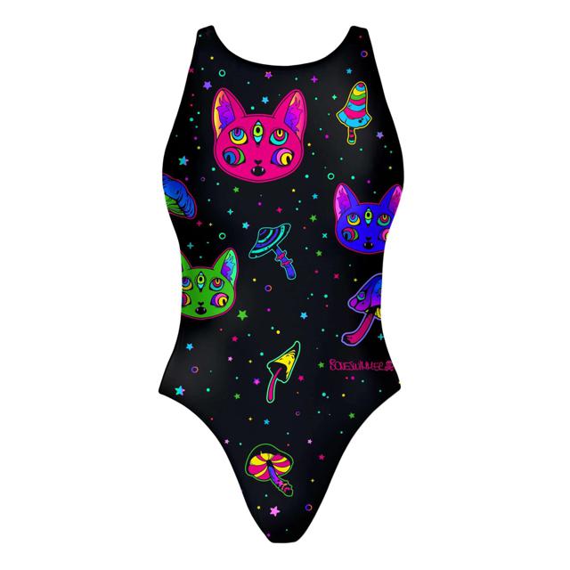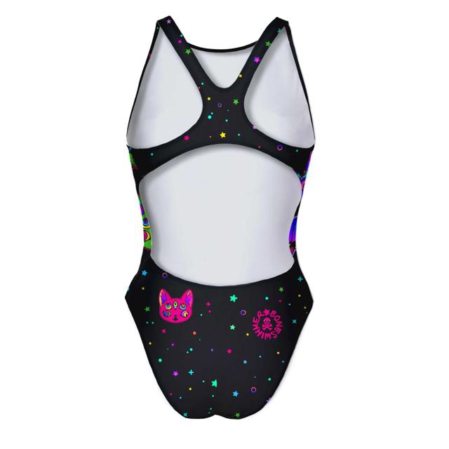 Costume intero sgambato con spalline larghe e aperto sui fianchi – 100%PL PBT resistente al cloro, all’usura e alle sollecitazioni più estreme.