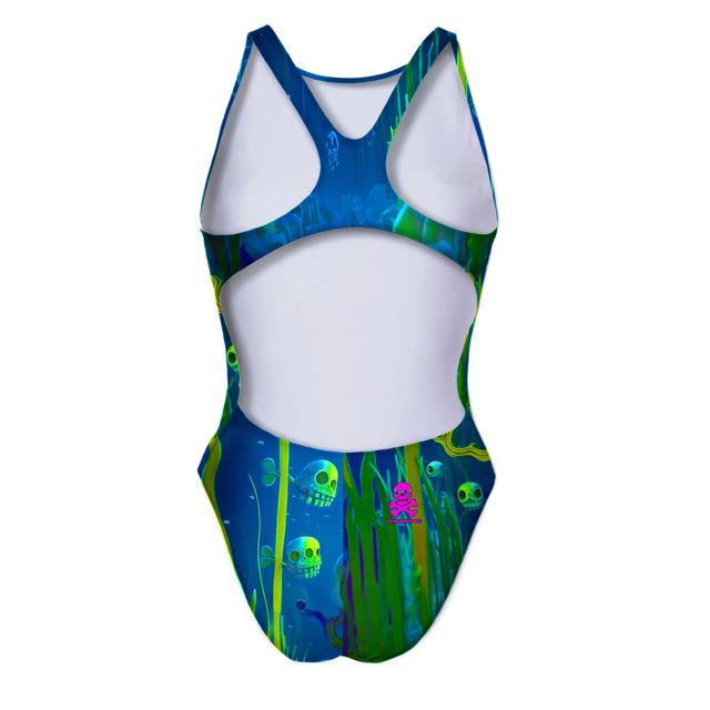 Costume intero sgambato con spalline larghe e aperto sui fianchi – 100%PL PBT resistente al cloro, all’usura e alle sollecitazioni più estreme.