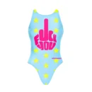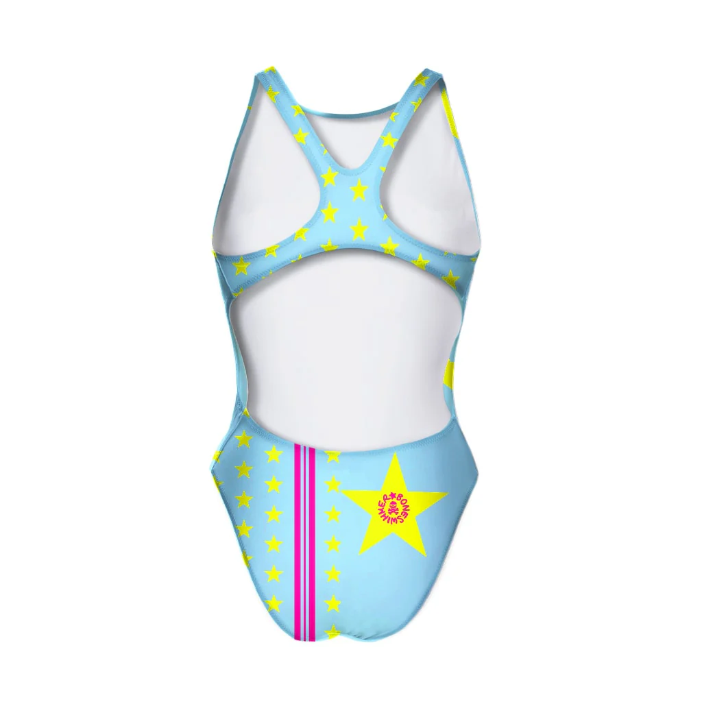 Costume intero sgambato con spalline larghe e aperto sui fianchi – 100%PL PBT resistente al cloro, all’usura e alle sollecitazioni più estreme.