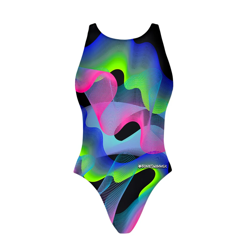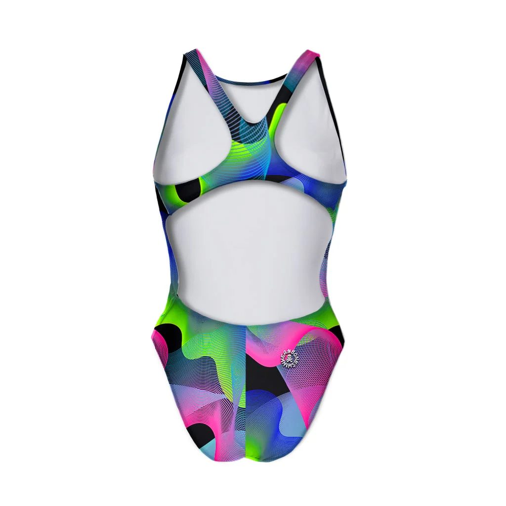 Costume intero sgambato con spalline larghe e aperto sui fianchi – 100%PL PBT resistente al cloro, all’usura e alle sollecitazioni più estreme.