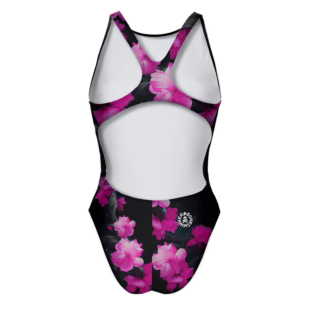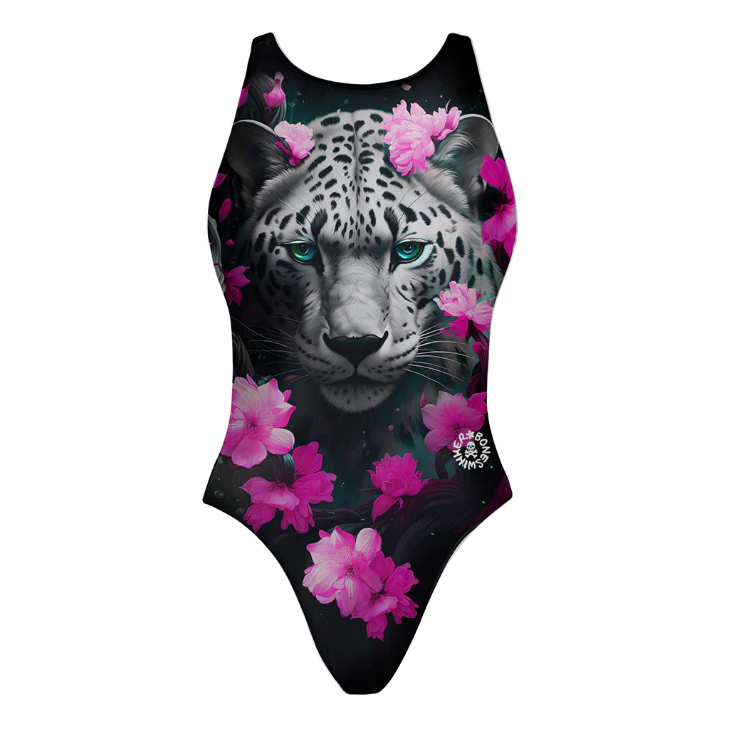 Costume intero sgambato con spalline larghe e aperto sui fianchi – 100%PL PBT resistente al cloro, all’usura e alle sollecitazioni più estreme.