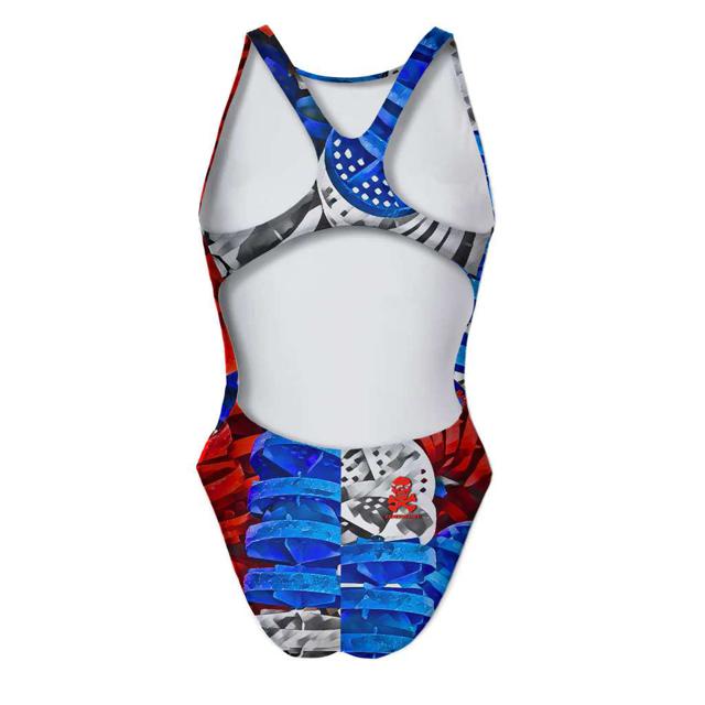 Costume intero sgambato con spalline larghe e aperto sui fianchi – 100%PL PBT resistente al cloro, all’usura e alle sollecitazioni più estreme.