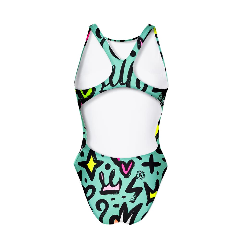 Costume intero sgambato con spalline larghe e aperto sui fianchi – 100%PL PBT resistente al cloro, all’usura e alle sollecitazioni più estreme.